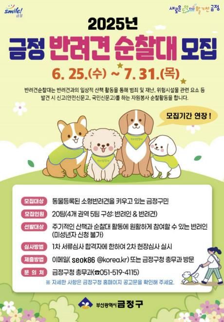 금정 반려견 순찰대 신청모집은 e-메일 및 방문 신청을 받고 있으며, 기존 18일까지 모집이었던 기간을 늘려 31일까지 연장하여 신청받고 있으며, 자세한 사항은 금정구청 홈페이지를 통해 확인할 수 있다.