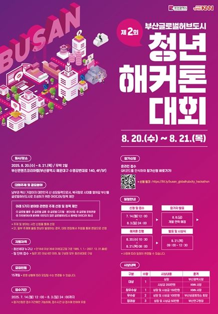 한방통신사 신유철기자 기자 | 부산시는 ㈜케이엔엔(KNN)과 함께 오는 8월 20일부터 21일까지 부산콘텐츠코리아랩에서 무박 2일 일정으로 '제2회 부산 글로벌허브도시 청년 해커톤 대회'를 개최한다고 밝혔다.