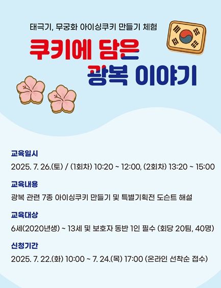 한방통신사 신유철기자 기자 | 부산시립박물관은 오는 7월 26일 부산박물관 특별기획전 '광복의 시간, 그날을 걷다'와 연계한 가족 교육프로그램 '쿠키에 담은 광복 이야기 : 태극기·무궁화 아이싱쿠키 만들기 체험'을 운영한다고 밝혔다.