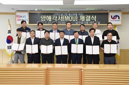 한방통신사 신유철기자 기자 | 부산 남구는 지난 7월 21일 오전 10시 30분, 남구청 5층 대회의실에서 지역 건설산업 활성화를 위해 관내 대형 건축공사장 시공사 관계자를 대상으로 양해각서(MOU)를 체결했다.