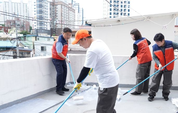 이번 사업은 좋은데이나눔재단, 부산신용보증재단, 해암문화재단 등 7개 기업과 2개 단체의 정성 어린 기부로 마련된 총 1,300만 원의 예산으로 추진됐으며, 주민 생활이 밀집된 골목의 노후 주택을 중심으로, 지붕에 태양열 반사 기능이 있는 친환경 페인트를 발라 실내 온도를 낮추는 방식으로 진행됐다.