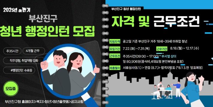 부산진구 관계자는 “청년 행정인턴 사업은 단순한 일 경험을 넘어, 청년들이 사회와 연결되고 자신의 진로를 주도적으로 설계하는 계기가 될 것”이라며, “공공 분야에 관심 있는 청년들의 적극적인 참여를 바란다”고 전했다.