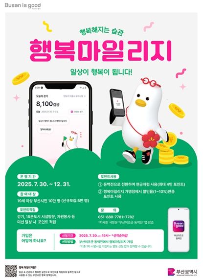 '부산 행복마일리지'는 '부산이즈굿 동백전' 앱을 통해 ▲걷기 ▲15분도시 시설 방문 ▲자원봉사 등의 활동으로 포인트를 적립하고 지역화폐 동백전으로 전환해 사용할 수 있도록 지원하는 시민 참여형 인센티브 제도다.