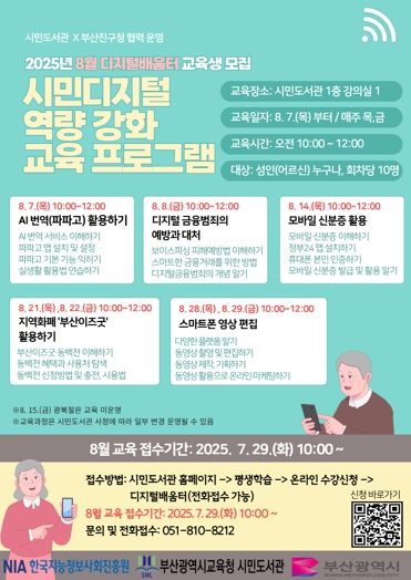 한방통신사 신유철기자 기자 | 부산광역시립시민도서관은 8월부터 11월까지 시민도서관에서 부산 시민을 대상으로 ‘시민 디지털 역량강화 교육 프로그램’을 운영한다.