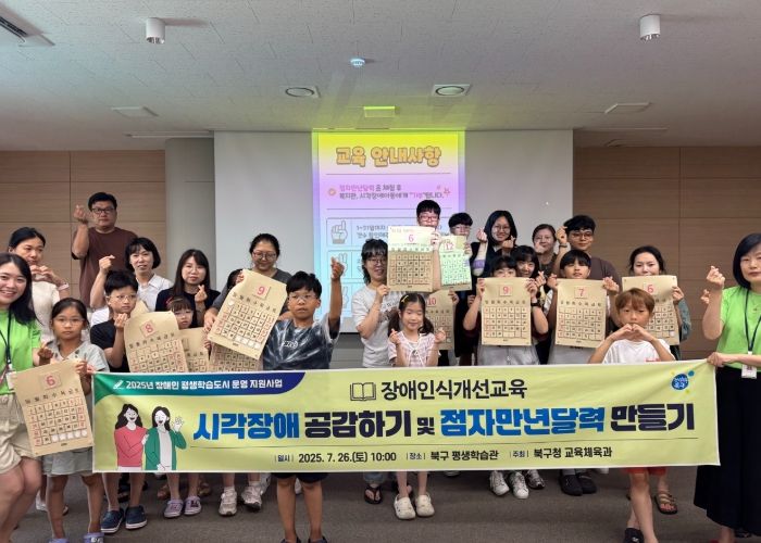 또한 북구 평생학습활동가로 구성된 ‘휴먼디자이너’ 동아리 회원들도 점자 만년 달력 만들기 활동에 참여해, 시각장애인을 위한 실생활 보조자료를 직접 제작하며 나눔과 배려의 가치를 체험했다. 완성된 점자 만년 달력은 관내 장애인 평생교육기관 또는 시각장애인 당사자에게 기증될 예정이다.
