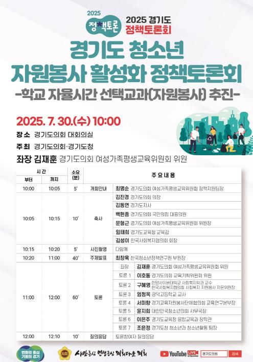 한방통신사 신유철기자 기자 | 경기도의회 여성가족평생교육위원회 김재훈 의원(국민의힘, 안양4)은 오는 7월 30일 10시 경기도의회 대회의실에서 '경기도 청소년 자원봉사 활성화 정책토론회 – 학교 자율시간 선택교과(자원봉사) 추진'을 개최한다.