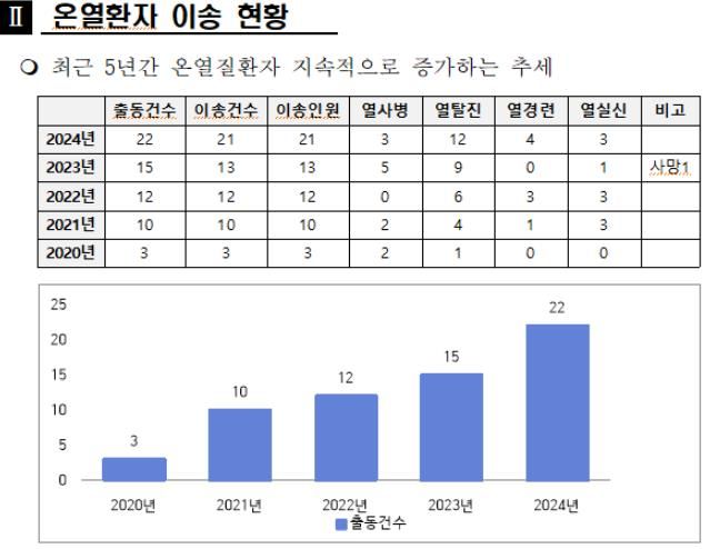 서산소방서는 따르면 최근 5년간 온열질환 환자 이송건수를 분석한 결과, 매년 온열질환자가 꾸준히 증가하고 있는 것으로 나타났다.