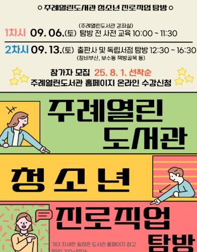 이번 청소년 진로직업 탐방은 총 2차시로 진행되며 먼저 1차시는 9/6 10시부터 90분간 도서관 사서가 하는 일, 사서가 되기 위해 준비해야 할 것 등 탐방 전 사전교육을 주례열린도서관 강좌실에서 진행할 예정이며 2차시는 9/13 부산 동구에 위치한 창비 부산을 방문하여 출판편집자와의 만남을 통해 출판 시장의 흐름과 운영관리를 체험한 뒤 부산 중구의 보수동 책방 골목의 다양한 독립서점을 돌아다니며 독립출판물 및 서적 큐레이션, 브래딩 가치를 경험하고자 한다.
