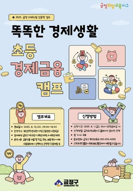 한방통신사 신유철기자 기자 | 부산시 금정구는 지역 내 전문 금융기관과 연계하여 초등학생들의 경제·금융의 기본 지식 학습을 위한녩년 미래드림 초등 경제·금융캠프' 참가자를 8월 1일 10시부터 금정희망교육지구 누리집을 통해 모집한다고 밝혔다.