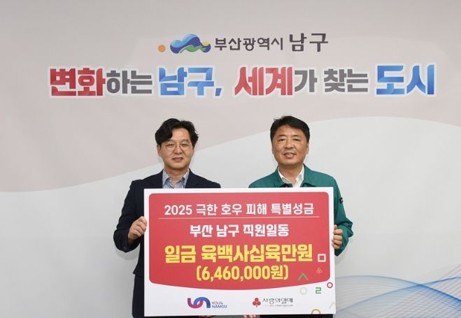 한방통신사 신유철기자 기자 | 부산 남구는 최근 전국에서 발생한 집중호우 피해 복구와 이재민 지원을 위해 남구청 전 직원이 자발적으로 참여한 특별 성금 모금 운동을 펼쳐, 총 646만 원의 성금을 사회복지공동모금회에 전달했다고 29일 밝혔다.