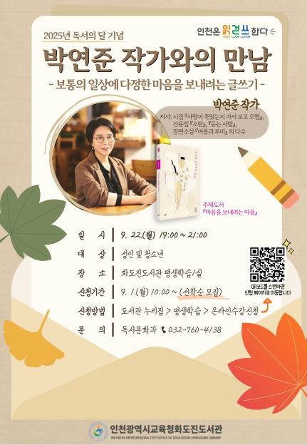 한방통신사 신유철기자 기자 | 인천광역시교육청화도진도서관은 9월 22일 오후 7시부터 9시까지 평생학습1실에서 박연준 작가와의 만남을 운영한다.