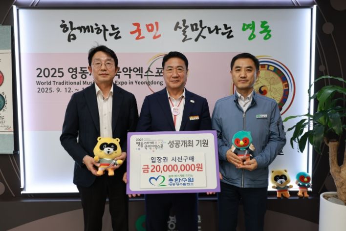 한방통신사 권영분기자 기자 | 영동양수건설소는 2일 영동군청을 방문해 2025 영동세계국악엑스포의 성공 개최를 기원하며 2,000만 원 상당의 입장권을 사전 구매했다.