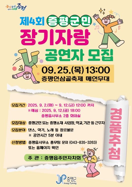 한방통신사 권영분기자 기자 | 증평읍주민자치회(회장 유덕열)가 오는 12일까지 ‘제4회 증평군민 장기자랑’ 참가자를 모집한다.