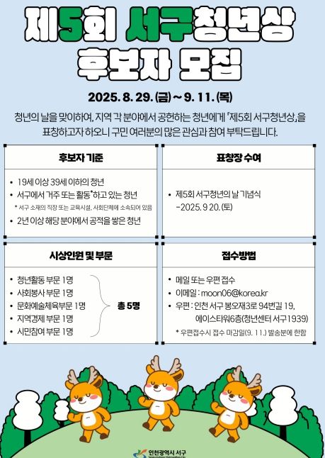 서구 관계자는 “지역을 위해 묵묵히 노력해온 청년들을 함께 발굴하고 응원하는 것이 청년상의 취지”라며, “서구의 미래를 이끌어갈 청년들의 많은 관심과 참여를 기대한다”고 전했다.