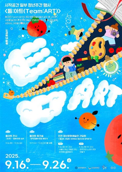한방통신사 신유철기자 기자 | 인천광역시와 인천문화재단은 오는 9월 16일부터 26일까지, 인천청년문화창작소 ‘시작공간 일부’에서 2025 청년문화예술네트워크 구축사업의 일환으로 청년주간 행사 '틈:아트(Team:ART)'를 개최한다.