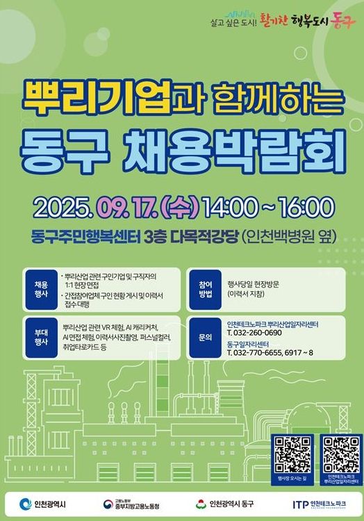 이번 행사에는 인천 동구에 있는 뿌리기업 20개 사 안팎이 참여해 1:1 현장 면접을 진행하고, 일자리 지원기관이 취업 지원 정보를 제공하며 맞춤형 취업 상담도 운영할 예정이다.