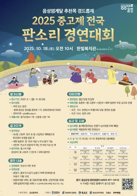 한방통신사 권영분기자 기자 | 음성군은 오는 10월 18일 한빛복지관에서 개최하는 ‘음성 염계달 추천목 경드름제 2025 중고제 전국 판소리 경연대회’의 참가자를 모집한다.