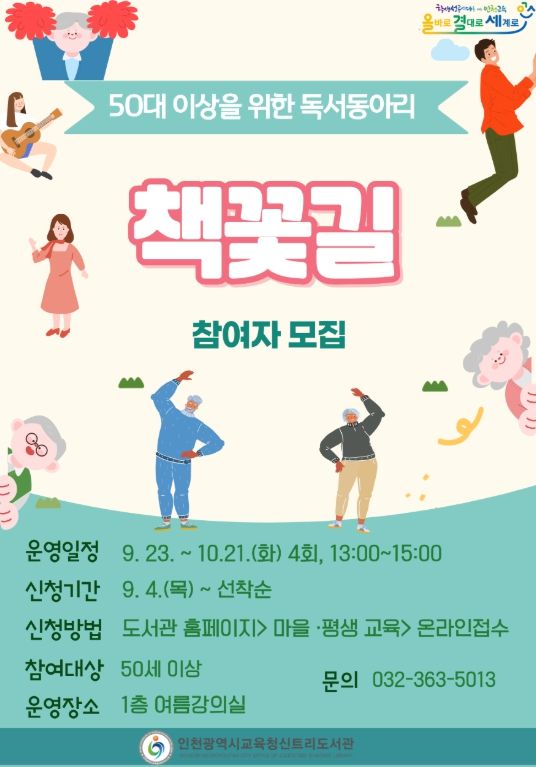 한방통신사 신유철기자 기자 | 인천광역시교육청신트리도서관은 50대 이상 시민을 대상으로 책을 통한 소통과 정서적 유대감 형성을 위한 ‘책꽃길’ 독서동아리를 오는 9월 23일부터 10월 21일까지 매주 화요일 총 4회 운영한다.
