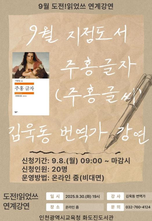 한방통신사 신유철기자 기자 | 인천광역시교육청화도진도서관은 9월 ‘독서의 달’을 맞아 오는 9월 30일 저녁 7시부터 9시까지 ‘도전! 읽었쓰’ 연계 강연 ‘주홍글자(주홍글씨)의 이해’를 비대면으로 운영한다.