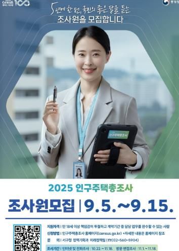 한방통신사 신유철기자 기자 | 인천 서구는'2025 인구주택총조사'를 함께 이끌어갈 조사원을 모집한다고 5일 밝혔다.