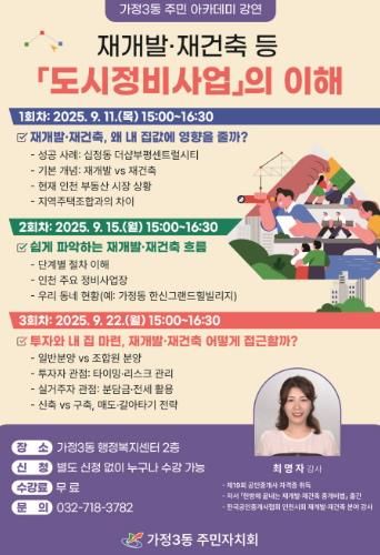 이번 강연은 별도 신청 없이 누구나 무료로 수강 가능하며, 9월 11일, 15일, 22일 세 차례에 걸쳐 가정3동 행정복지센터에서 진행된다.