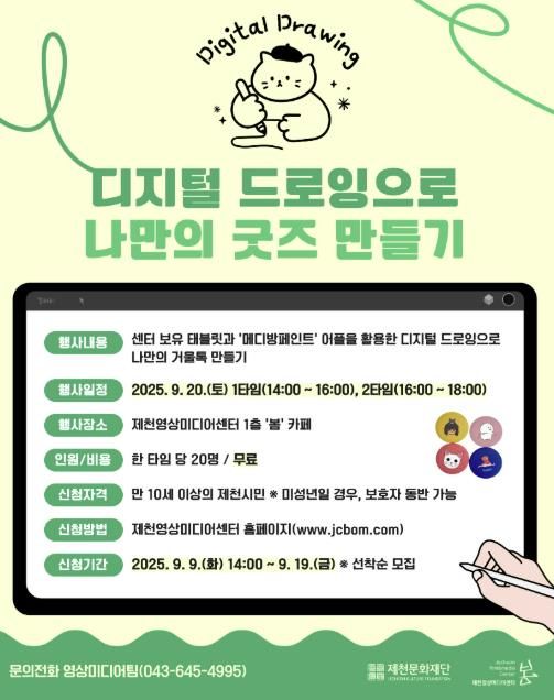 한방통신사 권영분기자 기자 | 제천문화재단은 오는 20일 제천영상미디어센터 1층 ‘봄’ 카페에서 '디지털 드로잉으로 나만의 굿즈 만들기' 프로그램을 진행한다.