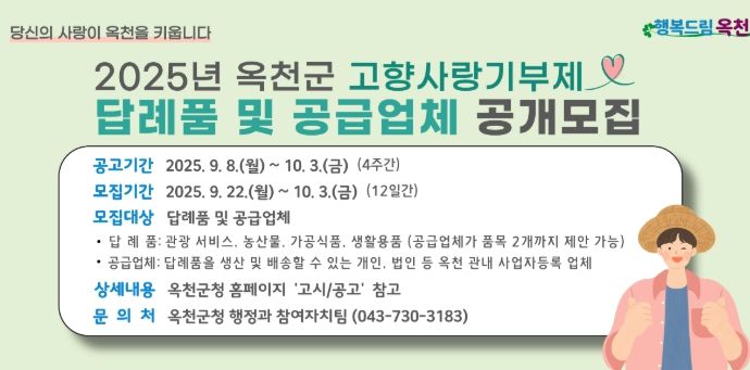 한방통신사 권영분기자 기자 | 옥천군이 8일부터 한 달 동안 고향사랑기부제 답례품 및 공급업체 추가 모집한다. 공급업체가 공모를 통해 답례품목을 제안하면 답례품과 공급자를 동시 선정하는 방식이다.