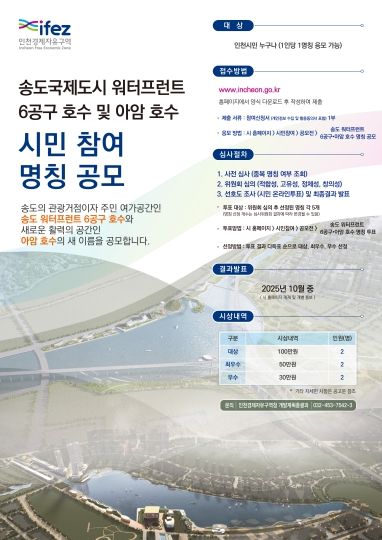 시민들이 자발적으로 참여하는 방식으로, 이달 8일부터 22일까지 인천시민이면 누구나 인천시 누리집(시민참여→공모전→송도국제도시 워터프런트 6공구·아암 호수 명칭 공모)을 통해 응모하면 된다.