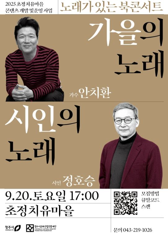 청주시와 청주시문화산업진흥재단은 ‘가수 안치환×시인 정호승의 노래가 있는 북콘서트’에 함께할 참여자를 모집한다고 8일 밝혔다.