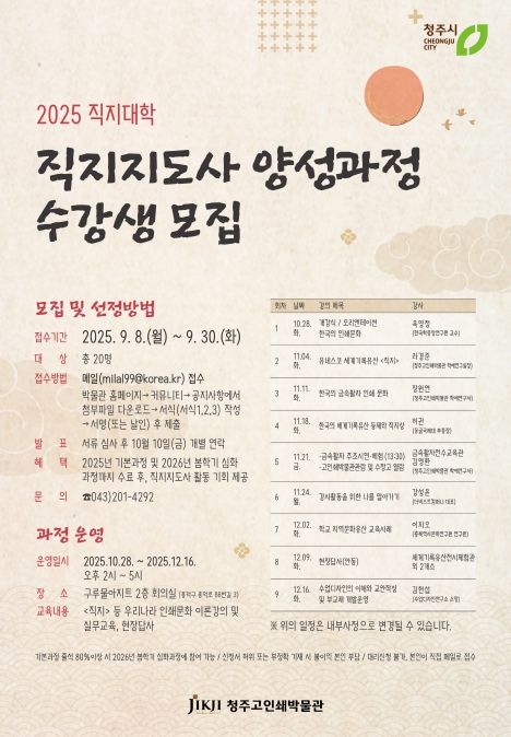 한방통신사 권영분기자 기자 | 청주고인쇄박물관은 2025년도 직지대학 직지지도사 양성과정 수강생을 모집한다고 8일 밝혔다.