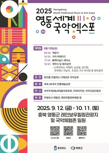 한편, 2025영동세계국악엑스포는 9월 12일 개막식을 시작으로 축제의 화려한 막을 연다. 축제의 시작을 기념하듯 사전행사로 국제민속축전기구협의회(CIOFF) 참가국과 공연 단체들이 거리 퍼레이드를 진행하고 블랙이글스 시범비행단의 에어쇼가 펼쳐진다. 개막식 당일 19시부터는 영동군민운동장에서 국악밴드 이날치 등이 개막식 축하공연을 선보일 예정이다.