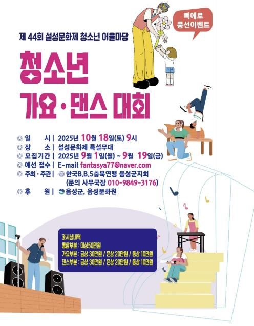 한방통신사 권영분기자 기자 | 한국B.B.S충북연맹 음성군지회는 제44회 설성문화제 프로그램 중 하나로 개최되는 청소년 어울마당 ‘청소년 가요·댄스 경연대회’ 참가자를 이달 19일까지 모집한다고 밝혔다.