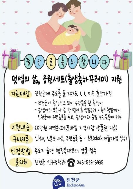 지원 대상은 2025년 1월 1일 이후 진천군에 출생 신고를 한 가정으로, 출생일부터 지원신청일까지 부모(또는 한부모)와 출생아가 진천군에 주민등록을 두고 있어야 한다.