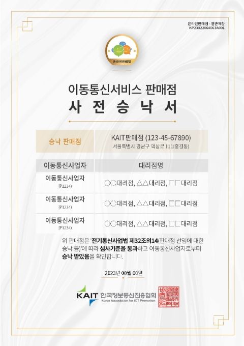 사전승낙은 이동통신사 대리점이 판매점과 거래를 맺기 전 일정 요건을 충족한 판매점에 개통 권한을 부여하는 제도로, 관련 인증표시가 부여된다.