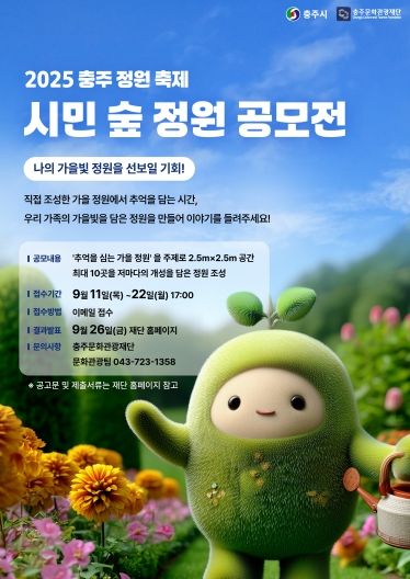 시민 숲 정원 공모전 관련 자세한 사항은 충주문화관광재단 홈페이지와 공식 SNS 채널에서 확인할 수 있다. 관련 문의는 충주문화관광재단 문화관광팀에 문의하면 된다.