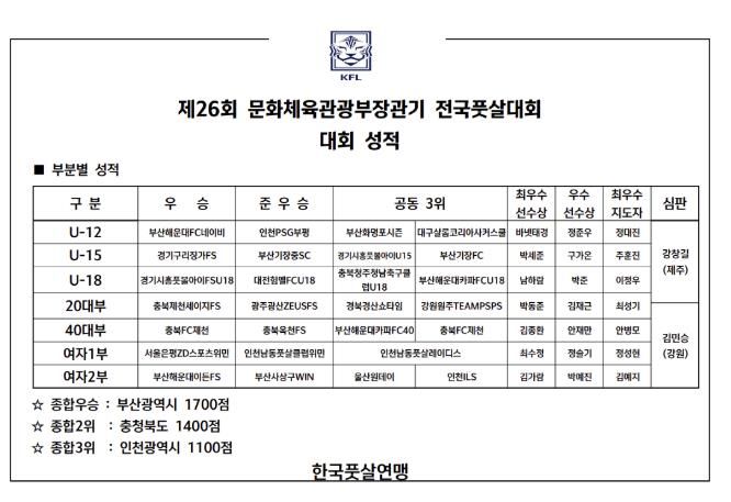 대회는 각 부별 시상과 종합시상을 끝으로 마무리 됐다. 부산광역시가 1,700점으로 종합우승을 차지했고, 충청북도가 1,400점으로 2위, 인천광역시가 1,100점으로 3위에 올랐다.