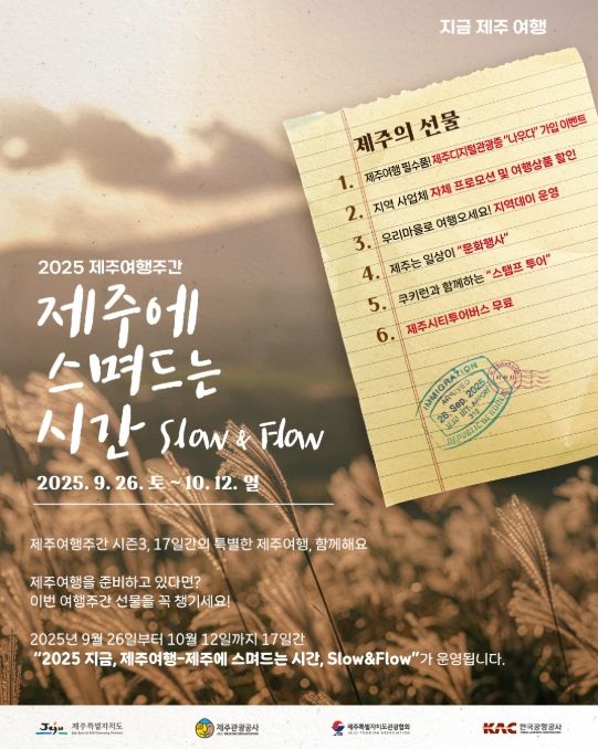 한방통신사 신유철기자 기자 | 제주특별자치도와 제주관광공사는 오는 26일부터 10월 12일까지 17일간 ‘제주에 스며드는 시간, Slow&Flow’를 주제로 웃가름(제주시내, 애월읍, 조천읍)과 알가름(중문) 지역에서 가을시즌 제주여행주간을 운영한다고 12일 밝혔다.