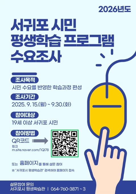 한방통신사 신유철기자 기자 | 서귀포시는 시민 의견을 바탕으로 2026년도 평생학습 프로그램 편성을 준비하고 분야별 강사를 공개모집하기 위해 온라인 수요조사를 진행한다.