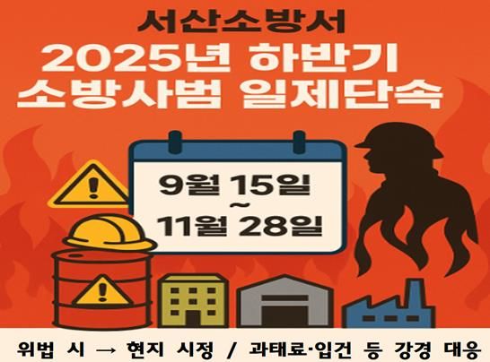 한방통신사 신태공 기자 | 서산소방서는 9월 15일부터 11월 28일까지 2025년 하반기 소방 사범 일제 단속을 실시해 시민 안전을 위협하는 불법 행위를 근절하기 위한 본격 수사에 돌입한다고 밝혔다.