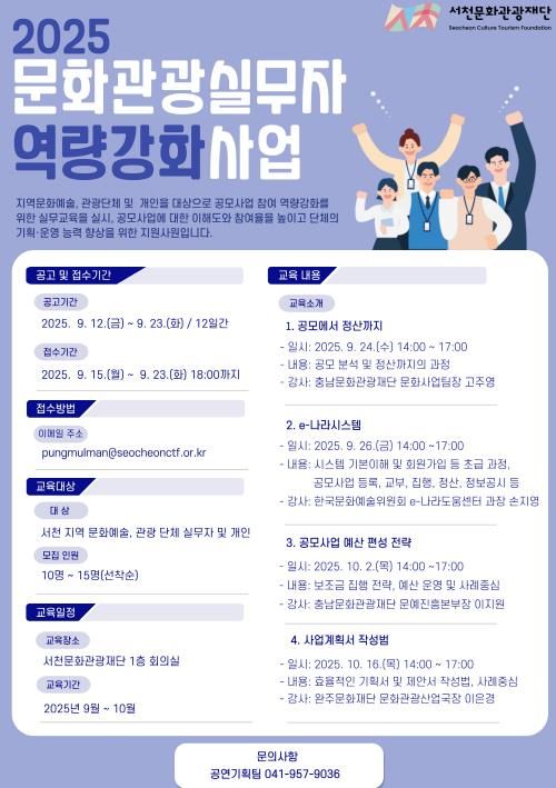 한방통신사 신태공 기자 | 서천문화관광재단은 지역 문화·관광단체 실무자 및 지역주민을 대상으로 공모사업 참여역량 강화를 위한‘2025 문화관광실무자 역량강화사업’참여자를 이달 23일까지 모집한다.