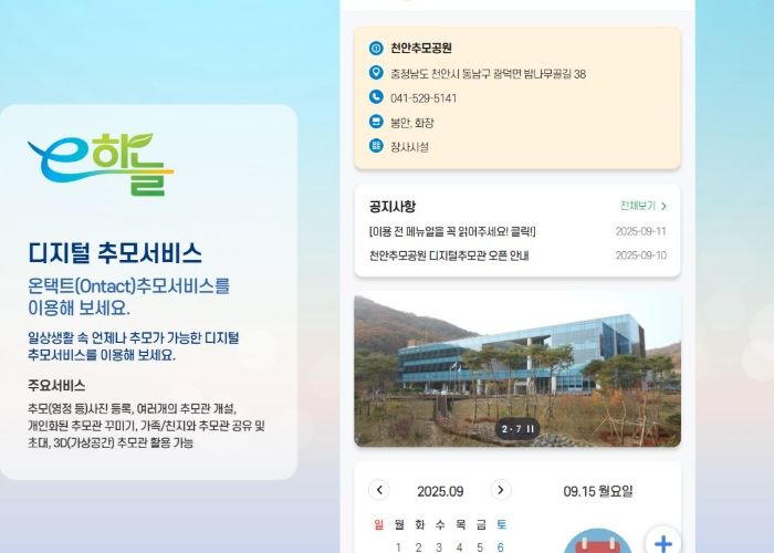 서비스는 천안추모공원 누리집에서 누구나 무료로 이용할 수 있으며, 정보무늬(QR코드)와 사회관계망서비스(SNS)를 통해 가족 등과 추억을 나누고 위로를 전할 수 있다.