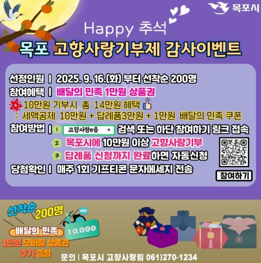 한방통신사 신다은기자 기자 | 목포시는 민족 최대 명절인 추석을 맞아 16일부터 ‘고향사랑기부제 감사 이벤트’를 진행한다.