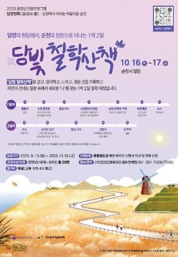 한방통신사 신다은기자 기자 | 담양군문화재단은 문화체육관광부와 한국문화예술위원회가 후원하는 2025 중장년 인문프로그램, 1박 2일 철학 기행 ‘담빛 철학산책-순천편’ 참가자를 모집한다.