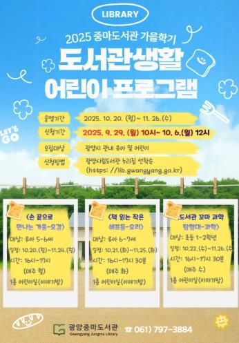 운영 강좌는 ▲유아 5~6세 대상 ‘손 끝으로 만나는 가을’ ▲유아 6~7세 대상 ‘책 읽는 작은 쉐프들’ ▲초등 1~2학년 대상 ‘도서관 꼬마 과학 탐험대’ 3개다.