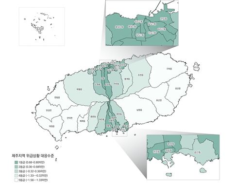 이번 연구에서는 ▲재난·사고 대응을 위한 119출동기관(5분 이내) ▲강력범죄 대응을 위한 112출동기관(5분 이내) ▲응급질환 치료를 위한 응급의료기관(15분 이내)까지의 접근성을 기준으로 '골든타임 서비스 권역'을 설정하고, 이 권역 내에 거주하는 인구 비율을 표준화하여 41개 읍면동(도로 데이터망이 구축되지 않은 추자면, 우도면은 분석 대상에서 제외)의 위급상황 대응수준을 분석했다.