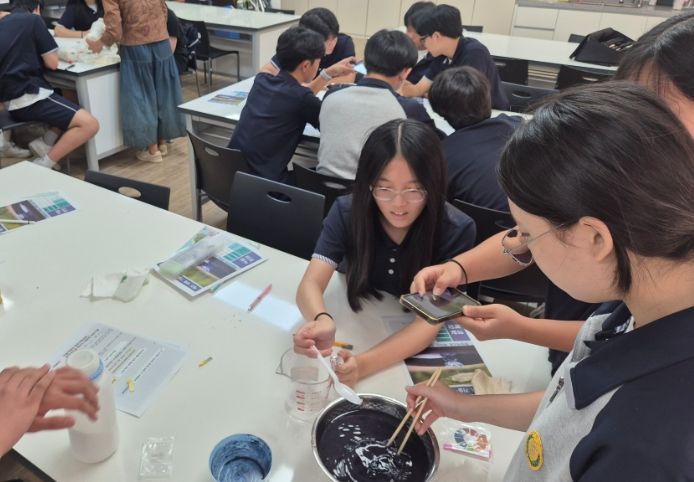 이 수업에서 학생들은 마을교육공동체 활동가이자 감물 염색 전문가인 박지혜 강사와 함께 전통 쪽염색을 체험하며 색이 변하는 과학 원리를 탐구하고 섬유의 성질과 화학 반응을 연결해 보는 경험을 쌓았다.