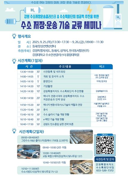 한방통신사 신유철기자 기자 | 강원특별자치도는 9월 25일부터 26일까지 동해 망상컨벤션센터와 동해·삼척 일원에서 '수소 저장·운송 기술 교류 세미나'를 개최한다고 밝혔다.