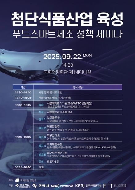 한방통신사 신유철기자 기자 | 경북도는 22일 국회의원회관 제1세미나실에서 강명구 국회의원과 공동으로 ‘첨단식품산업 육성 푸드 스마트제조 정책 세미나’를 개최했다.