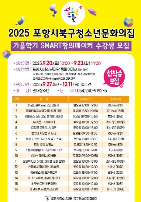 한방통신사 신유철기자 기자 | 포항시청소년재단 북구청소년문화의집은 지역 청소년들의 창의력 향상과 진로 체험을 위해 ‘2025년 가을학기 Smart창의메이커’ 프로그램 수강생을 선착순 모집한다.