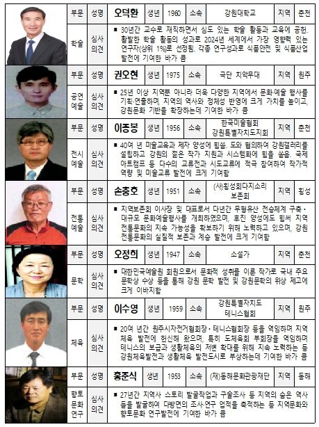 한방통신사 신유철기자 기자 | 강원특별자치도는 강원문화 발전과 향토문화 보존·증진에 기여한 유공자를 시상하기 위해 '제67회 강원특별자치도 문화상 심사위원회'를 개최하고, 7개 부문 7명의 수상자를 최종 확정했다고 밝혔다.